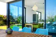 Das gradlinige moderne Bungalow-Gebäude bestehend aus zwei Wohnungen bildet einen gelungenen Kontrast zum kleinen historischen ziegelgedeckten Häuschen, das sich hinten anschließt. Große Glas-Schiebetüren geben dem Gebäude ein luftiges und transparentes Ambiente und geben den Blick frei ins Grüne.